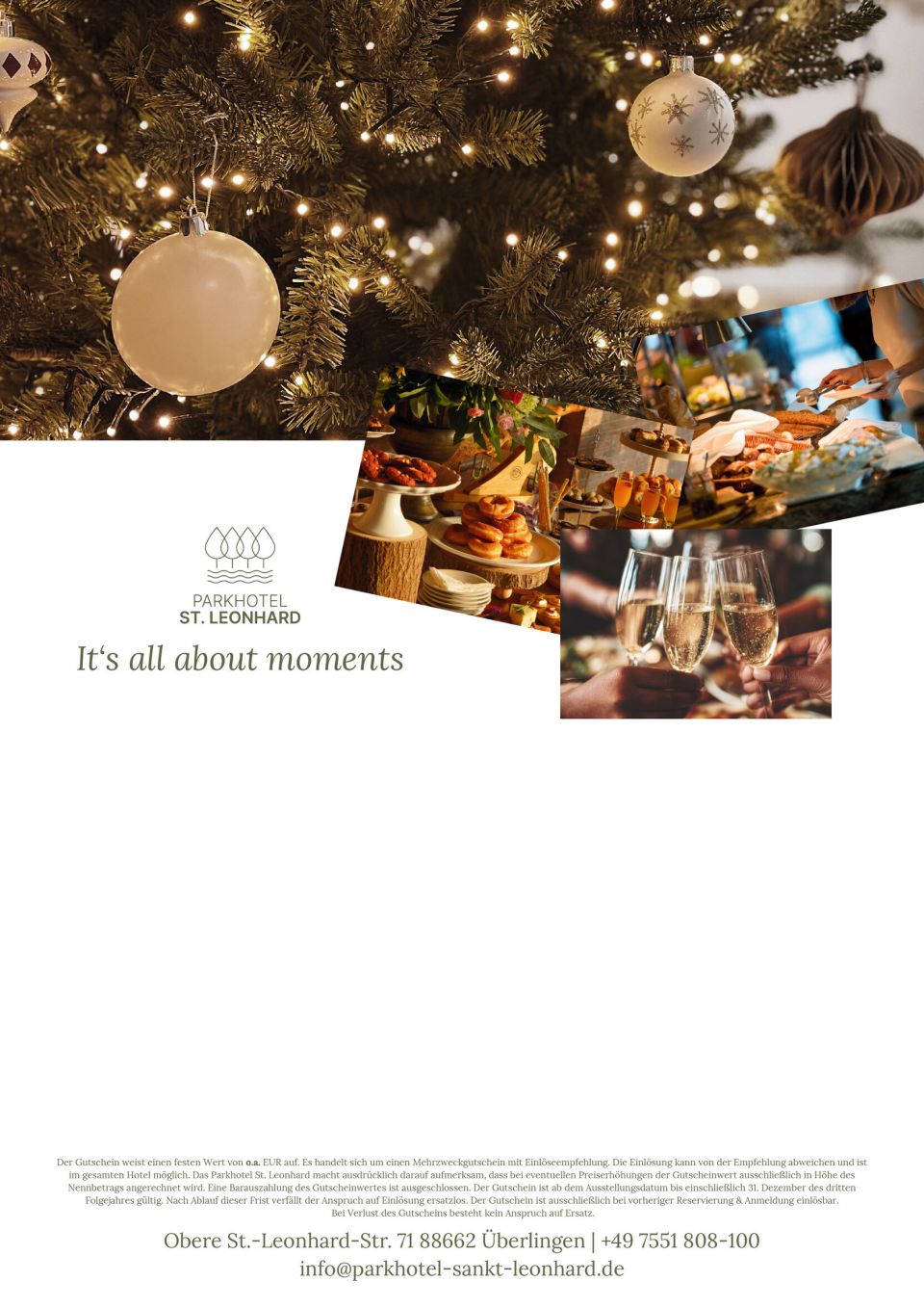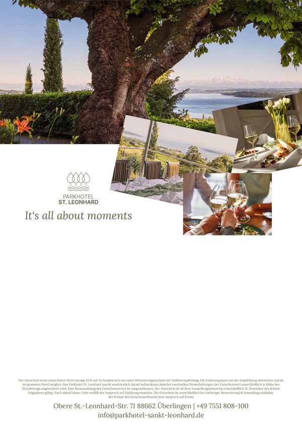 Ich möchte Dir mit diesem Gutschein eine kleine Freude bereiten. Genieße einzigartige Stunden im Parkhotel St. Leonhard über dem Bodensee und lass' wieder mal richtig die Seele baumeln!
