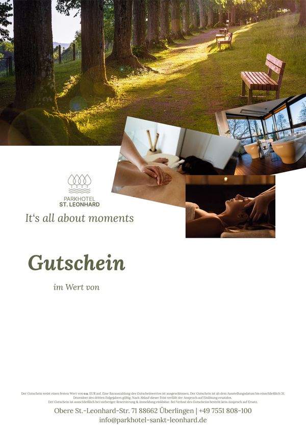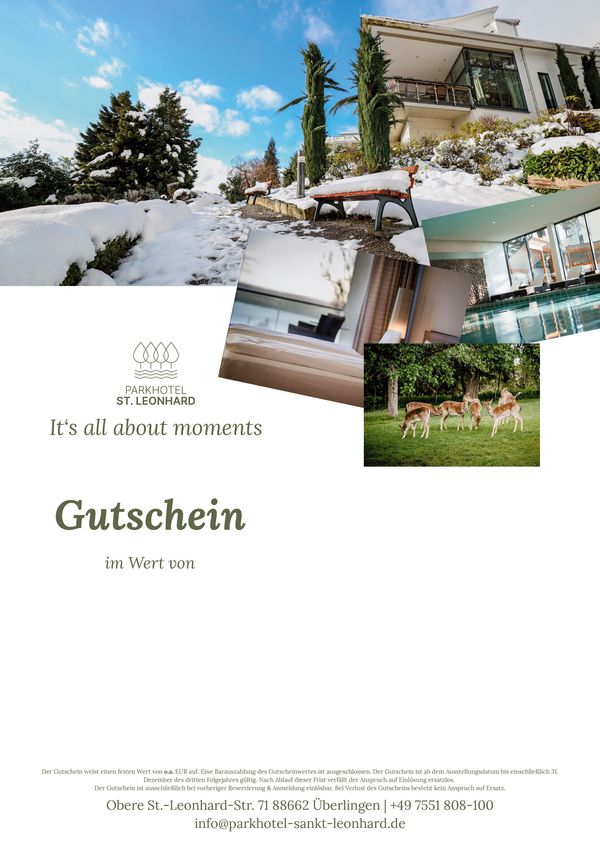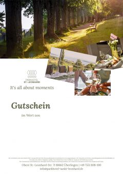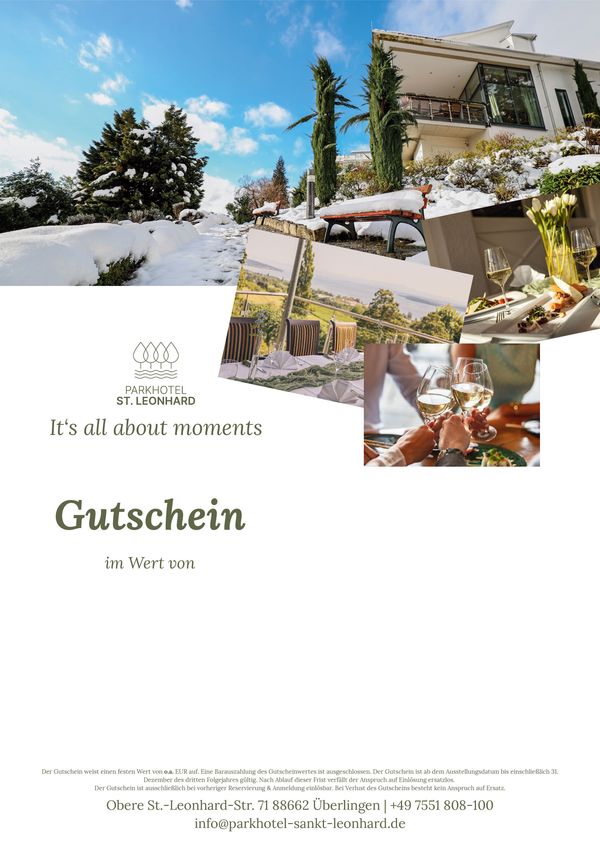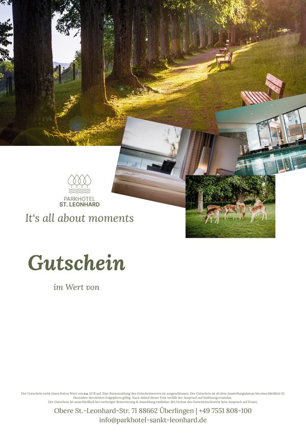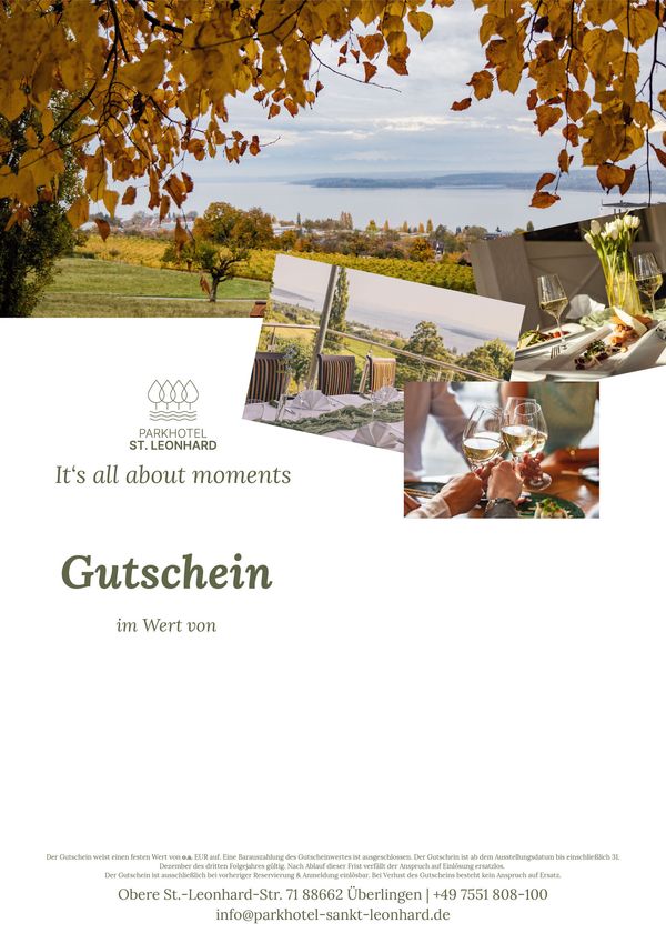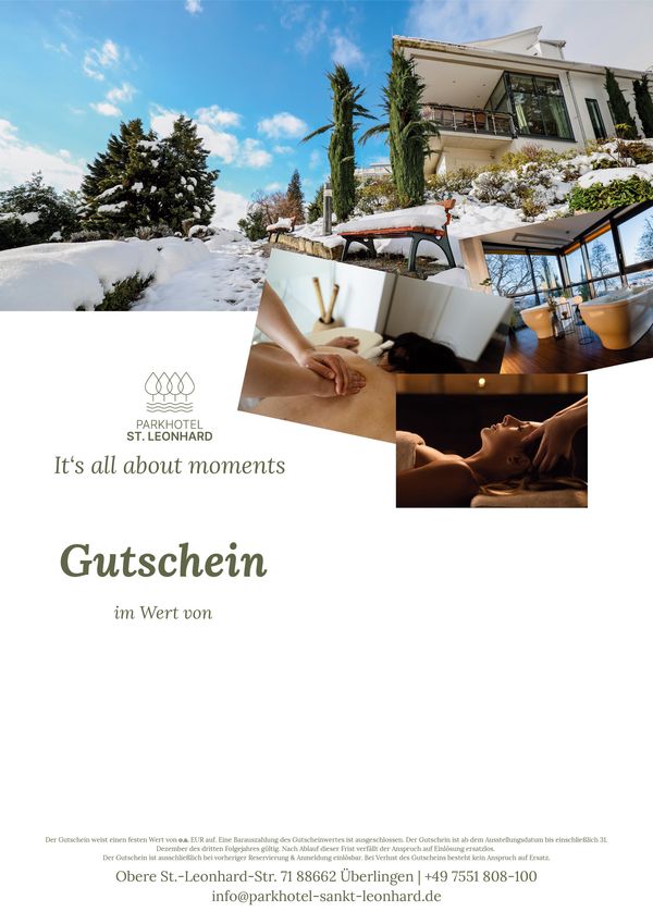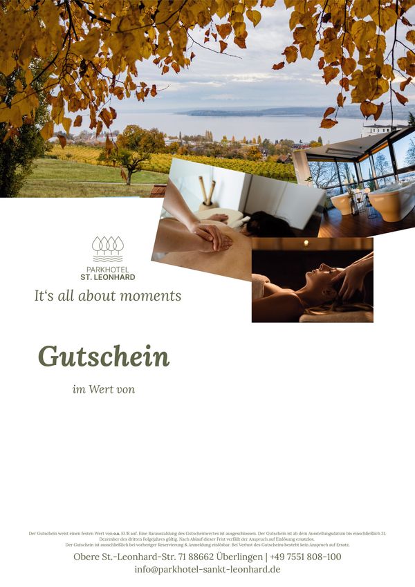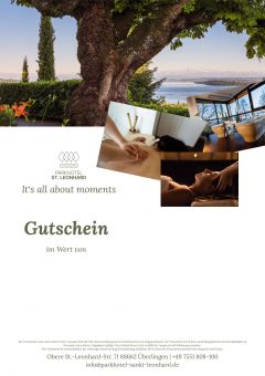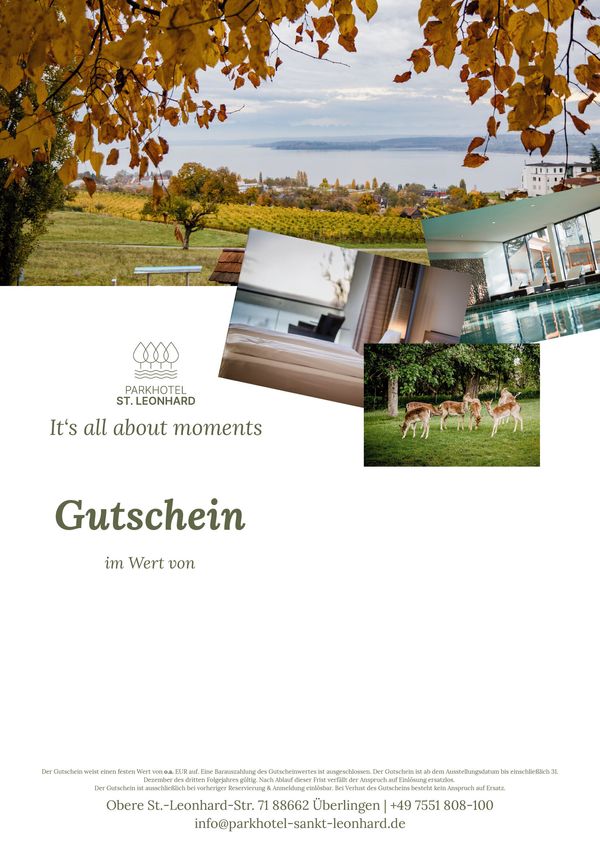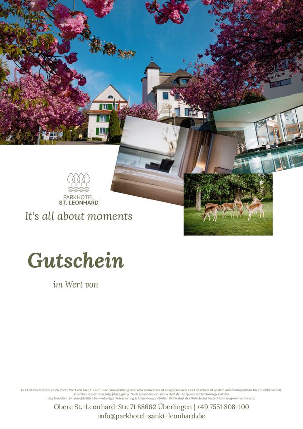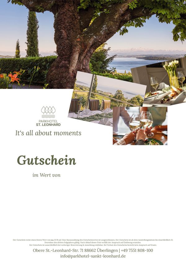 Ich möchte Dir mit diesem Gutschein eine kleine Freude bereiten. Genieße einzigartige Stunden im Parkhotel St. Leonhard über dem Bodensee und lass' wieder mal richtig die Seele baumeln!